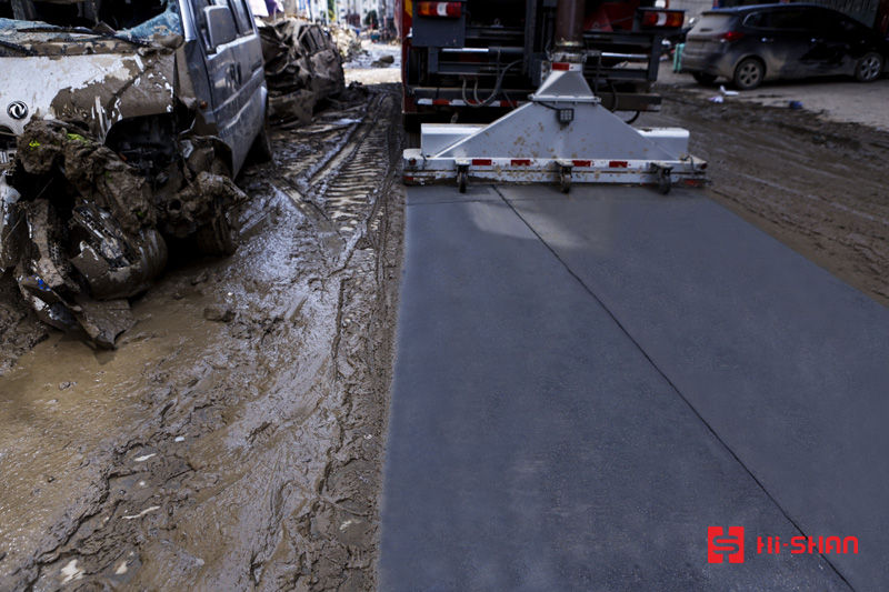海山機械11名救援隊員攜帶搶險救災利器——地面道路機能恢復/污染清除車和步履挖掘機從莆田出發。在武警官兵的引導下救援隊克服艱難險阻,終于4小時后抵達坂東鎮。洪峰肆虐過的街道滿目瘡痍,泥漿垃圾遍地,洪流裹挾來的樹木、家具、房屋構件、汽車殘骸到處都是,有的甚至豎到了二樓;救援隊員見此情景顧不上路途顛簸勞頓,馬上與武警官兵一同研究制定救援行動方案。