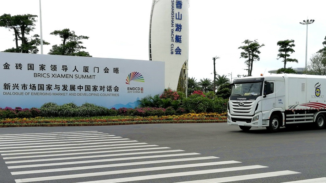 廈門市環(huán)衛(wèi)為了以最好的城市面貌迎接金磚峰會,從福建海山機械股份有限公司采購了代表當(dāng)今道路深度清潔世界先進(jìn)水平的重器–重型道路污染清除車,以滿足高標(biāo)準(zhǔn)會場以及核心區(qū)域的地面環(huán)境要求,使廈門以更加靚麗的姿態(tài)迎接來自世界各地的金磚貴賓。